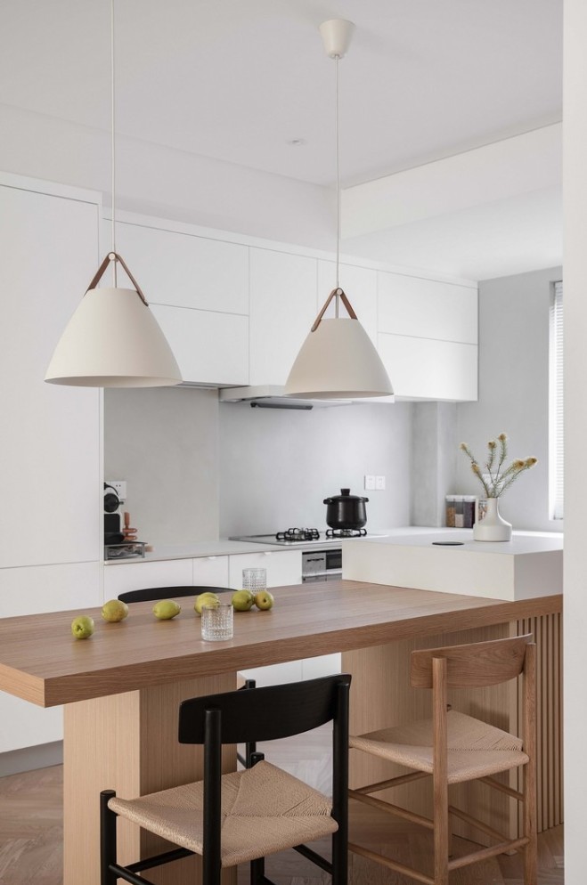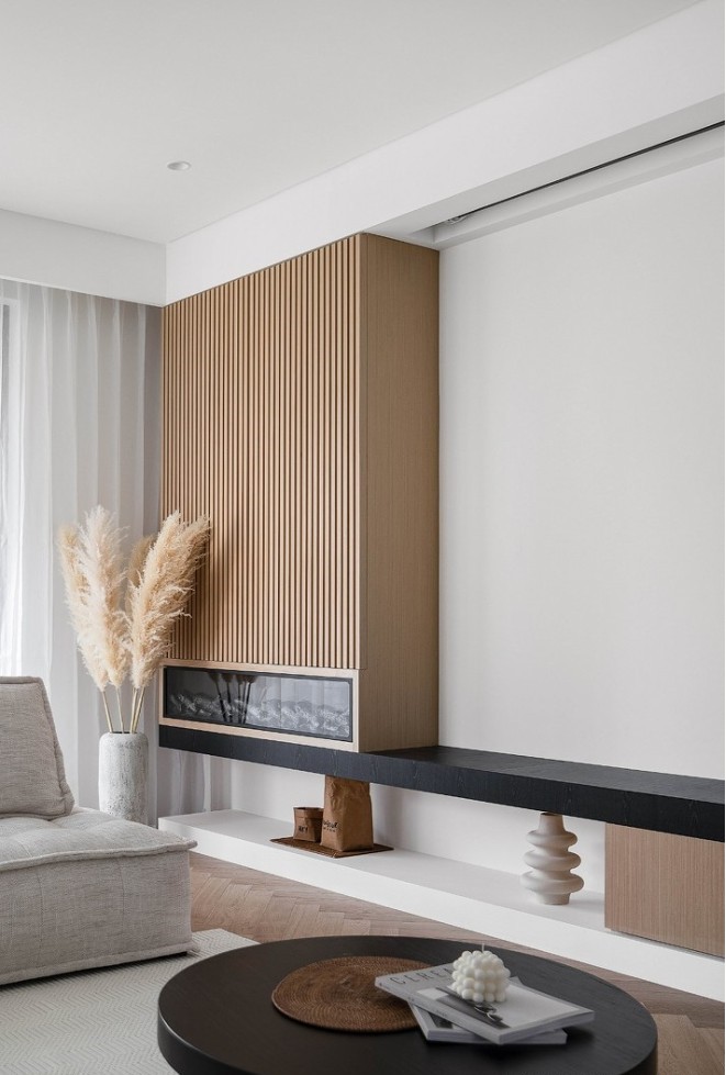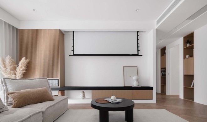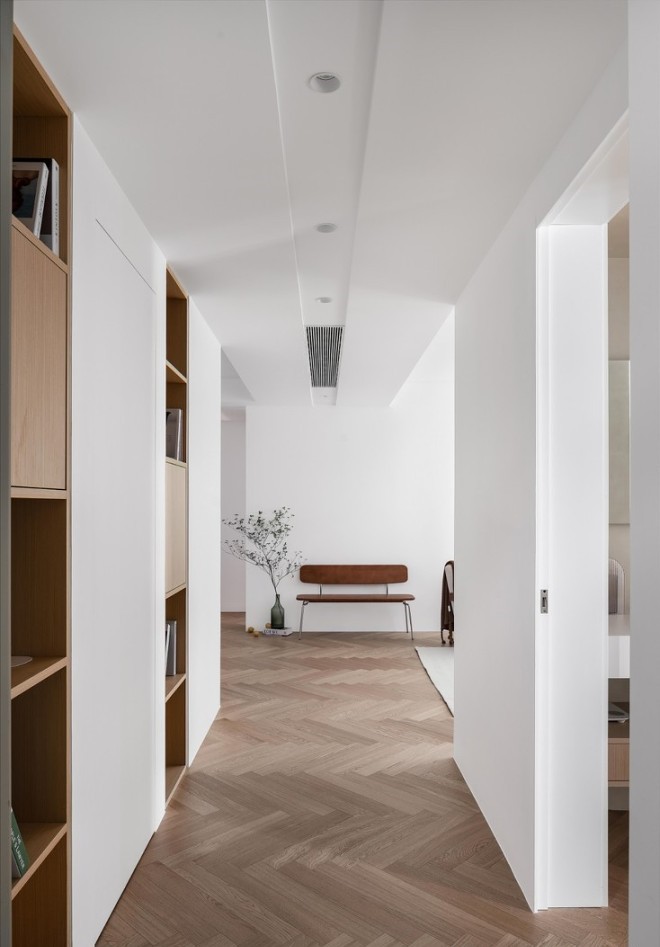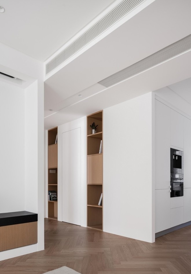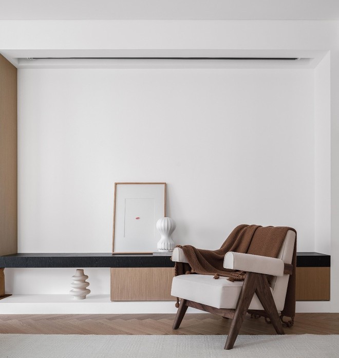 設(shè)計說明:這是18年的設(shè)計案子,房主是三口之家,是一個對設(shè)計和生活都很注重的知識青年,有著很好的審美和品味。平時比較安靜,閑暇時間喜歡看書和影視。整屋改動最大的是做了衣帽間。風格上結(jié)合屋主喜歡的樸實簡潔,選定北歐極簡。整套住宅大面積的采用了素雅的原木色與白色,營造出自然、安靜舒適的居住環(huán)境。入戶走廊鞋柜采用三段式分化設(shè)計,利用隱形門巧妙隱藏了大收納的衣帽間入口,讓進門不再是原始的門洞堆積,繁忙雜亂??蛷d采用全吊頂無主燈設(shè)計,背景墻的白色、暖色的沙發(fā)與木色的電視柜,簡潔黑色的木飾面,營造出干凈整潔的家居氛圍。開放式廚房設(shè)計增加了空間的通透性,融入了蒸箱及烤箱的西餐功能,讓中西廚文化有了面對面的交流。