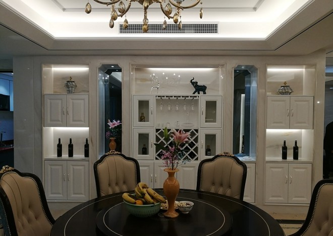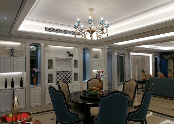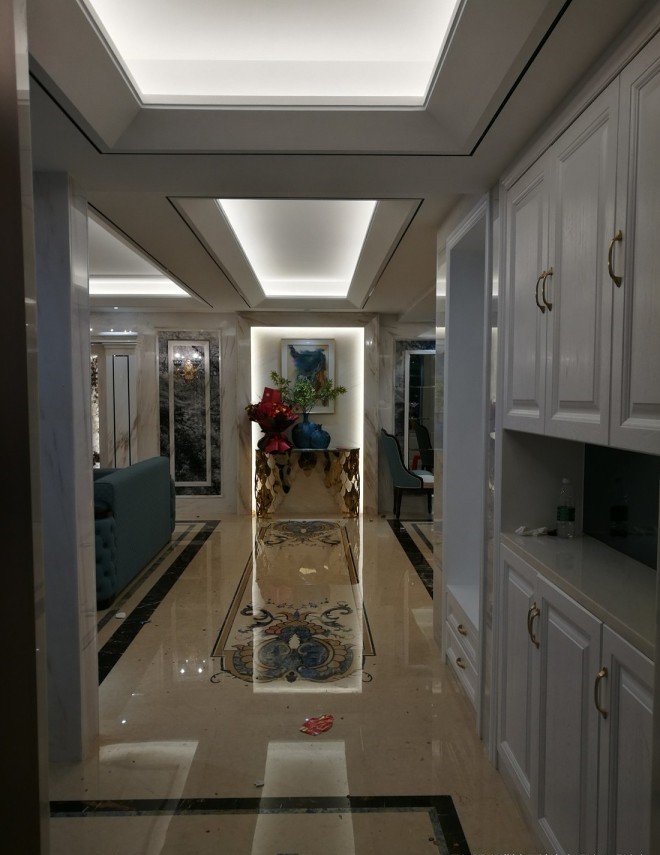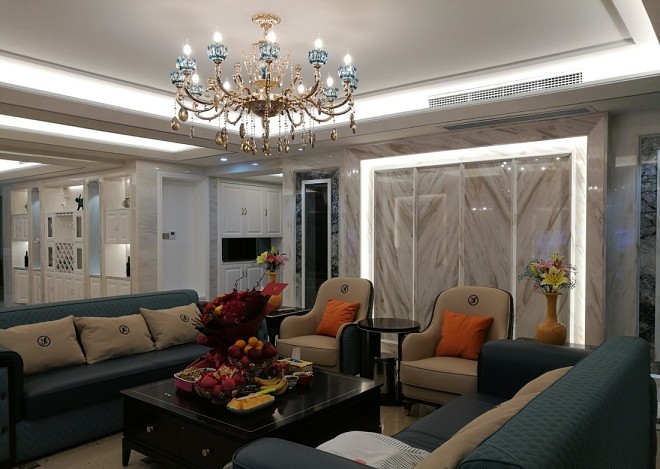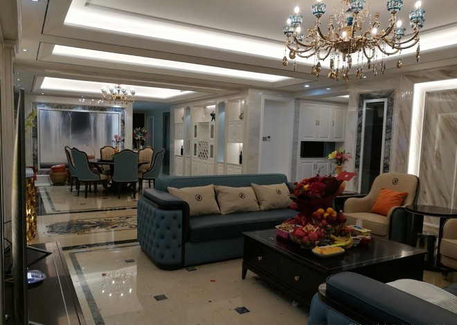 設(shè)計(jì)說明:房主是三口之家,房主本人五十多歲左右做工程的,家有一老人,小孩已成家自立門戶。因?yàn)榉恐鞴ぷ髟颍袃?yōu)厚的建材資源,所以本案里大量的運(yùn)用了石材。本案重在功能空間的合理劃分和動(dòng)線的合理排布,房主對(duì)生活品質(zhì)有要求,要求大氣、環(huán)保凈化設(shè)備齊全。也因?yàn)榉恐鞴ぷ髟蚱綍r(shí)來訪朋友比較多,需要一個(gè)會(huì)客茶室,所以本案打通了書房與北陽臺(tái)開拓出了一個(gè)會(huì)客茶室,也因稱重墻原因,所以在餐廳與茶室之間設(shè)計(jì)一個(gè)石材屏風(fēng)背景,左邊的臥室過道與右邊的茶室入口從視覺上讓整個(gè)大廳有了延伸感,也增加了客餐廳與會(huì)客茶室間的互動(dòng)性,整個(gè)大廳的米色的石材、淺藍(lán)的家具軟裝與銀鏡結(jié)合讓整個(gè)空間變得更加大氣又不失靈動(dòng)。