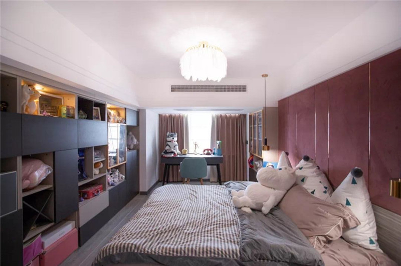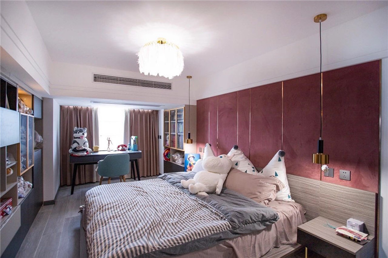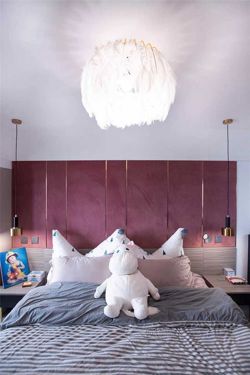 因房子在江邊,東南兩側(cè)全景玻璃,采光充足,在地磚.地板.柜體.臥室門等的選色上,特意選擇了較暗的色系,讓明暗形成互補,在樓梯間與主人房制作粉色的涂料與軟包,特顯女主人的高雅品位,同時讓空間色彩豐富而別致。