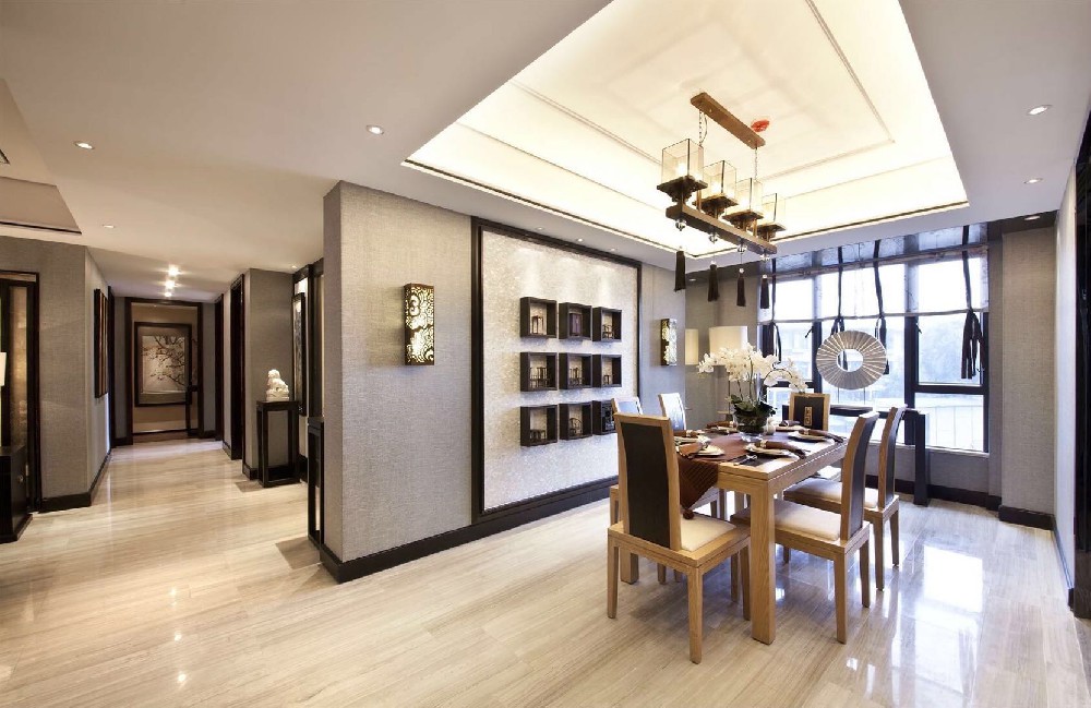 客廳和餐廳相連,擁有非常流暢的動線。爵士白大理石的餐桌、造型華麗的水晶吊燈、身后精典的大酒柜……這所有的一切都在醞釀著精致舒適的就餐氛圍。特別是大酒柜,上面的玻璃柜門能夠撤出撤回,內嵌的燈帶,帶來一絲華貴的氣息,如恰臨奢華酒會,給人一種迷離恍惚的感覺。