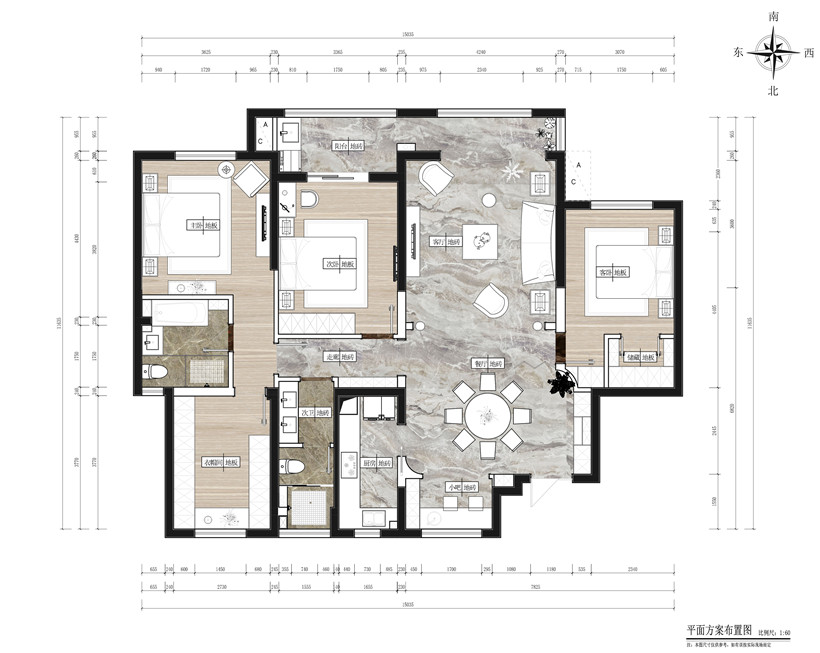 主要用材:諾貝爾大理石、長頸鹿地板、金牌定制家具、墻布。