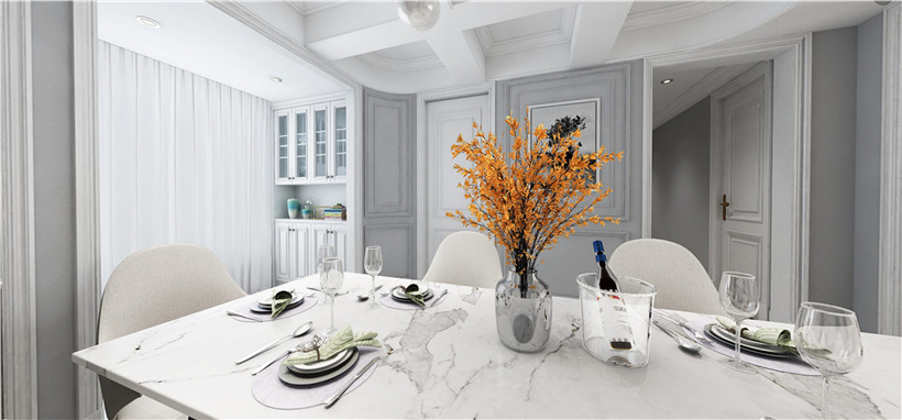而廚房的房門與墻面線條協(xié)調(diào)的相處在一起。與此同時我們利用造型立柱把客餐廳做頂面的區(qū)域劃分,也解決了