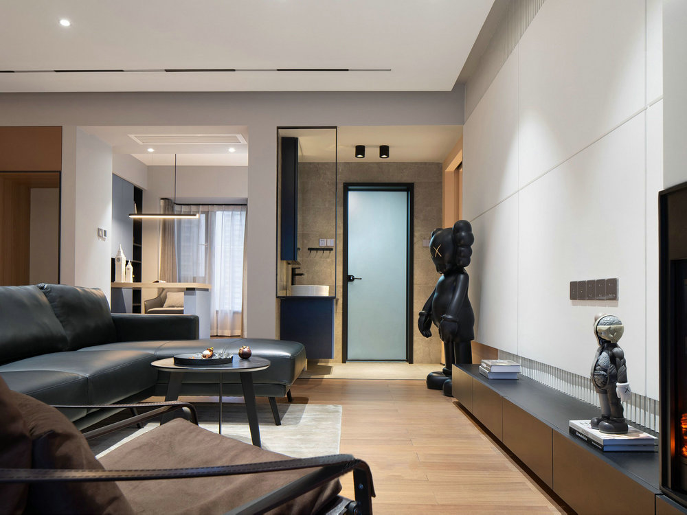 客餐廳利用黑白灰塑造出干凈利索的感覺,電視背景墻用白色為主的大理石砌成,全房鋪貼灰色系墻紙,硬裝出簡(jiǎn)潔大氣的居家環(huán)境。