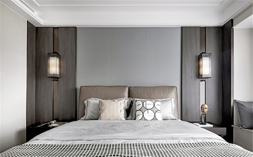 在硬裝設(shè)計上我們以電視背景墻為中心做白色大理石,左右以深色的雞翅木飾面板為對稱,形成視覺的舒適度。在沙發(fā)背景墻上有意做了一塊半弧度造型的皮革硬包背景,并在它的一圈做了暗藏?zé)艄庠O(shè)計,體現(xiàn)出造型的輪廓感,有意做這個弧形背景是個角落沒有重要的東西需要放,可以縮小它的一些空間并放一個落地?zé)羰呛芎线m的,弧形的設(shè)計也讓空間有著更優(yōu)美的體現(xiàn)。