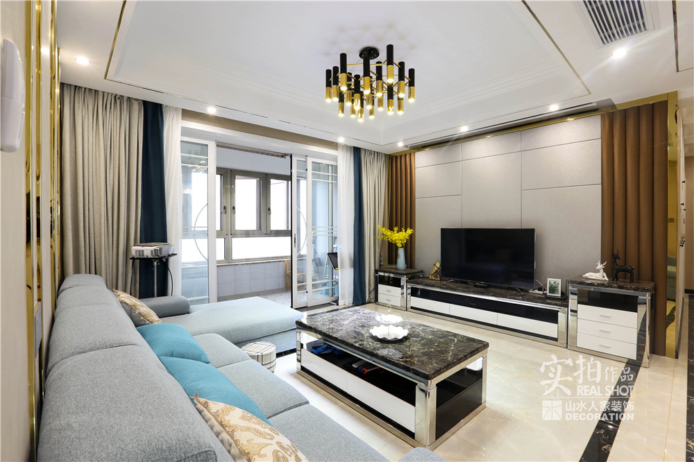 電視背景墻采用獨(dú)到的處理方式,大面巖板上墻,呈現(xiàn)時(shí)尚現(xiàn)代的特征。兩邊電視墻木色+金屬的對(duì)稱造型,效果一級(jí)棒。底部放置了木色電視柜+裝飾柜,起到裝飾儲(chǔ)物的實(shí)際功能。