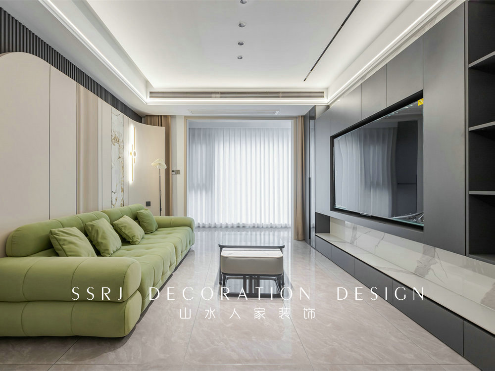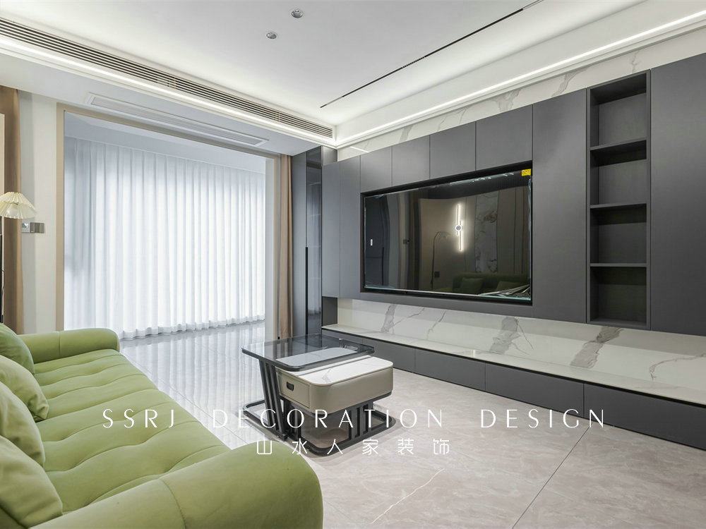 巖板電視背景墻簡(jiǎn)約大氣,內(nèi)嵌黑色電視柜,儲(chǔ)物展示功能拉滿。整體有著鮮明的黑白色對(duì)比,簡(jiǎn)潔的線條勾勒出穩(wěn)定的生活細(xì)節(jié),給予空間更多遐想。
