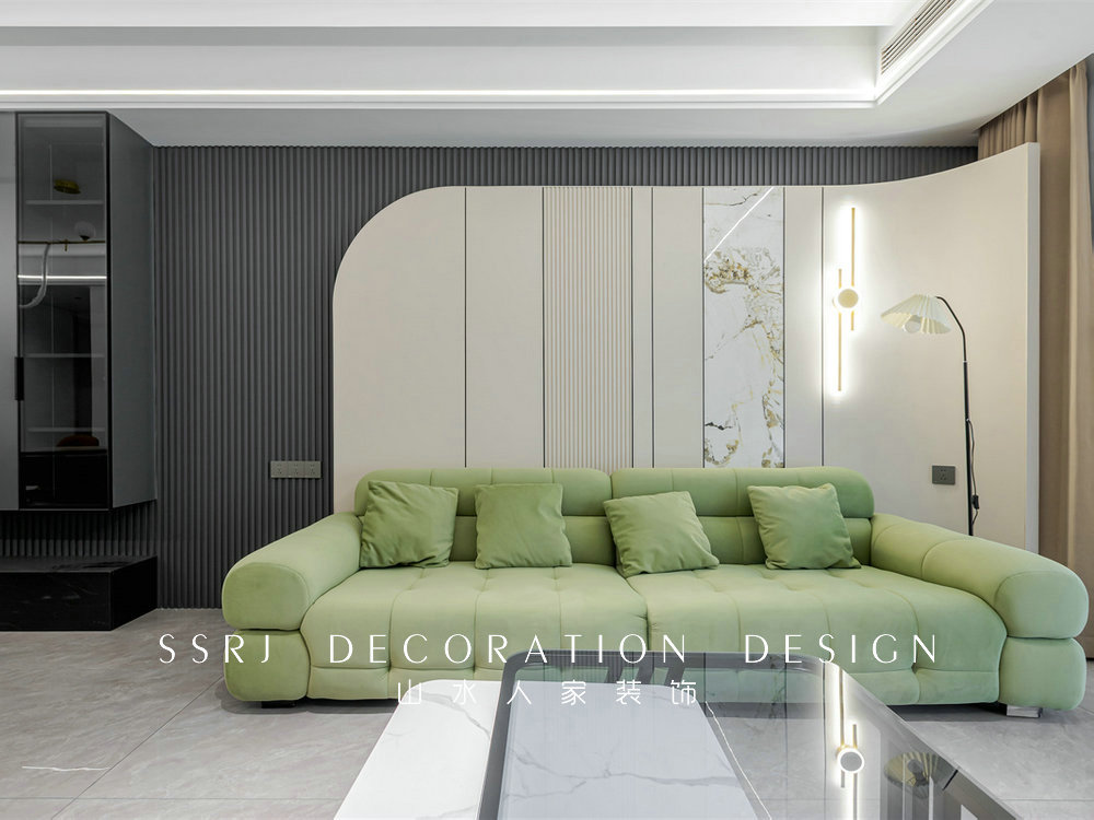 格柵+墻板的客廳背景墻加入對(duì)比色,搭配出和諧自然的效果,富有現(xiàn)代感。同時(shí)做了弧形墻面的造型,愈加柔化空間,成為主要的視覺(jué)焦點(diǎn)。果凍沙發(fā)坐上去就不想起來(lái),如同微熟的青蘋(píng)果,酸甜有味。