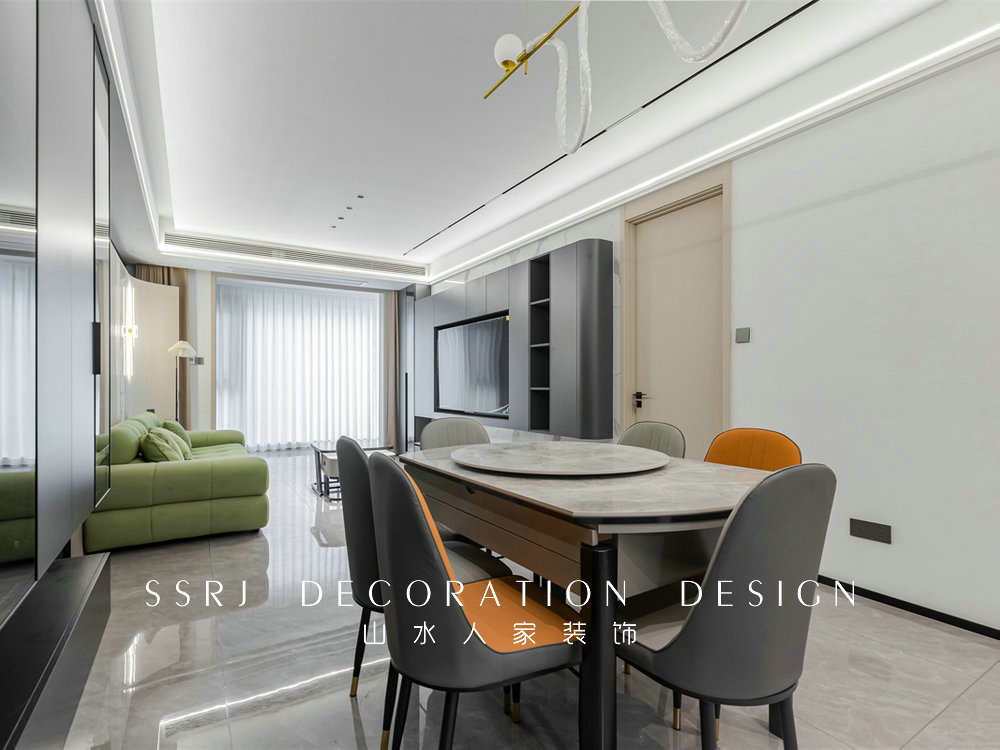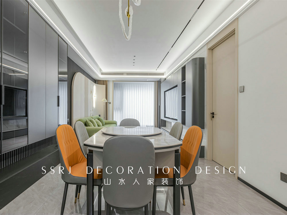 巖板餐桌是現(xiàn)代餐飲生活的標(biāo)配,非常適合有品味的家庭使用。搭配橙灰配色的餐椅,起到豐富空間色調(diào)的效果。一家人在餐廳和諧地吃著飯,一同放松交流。