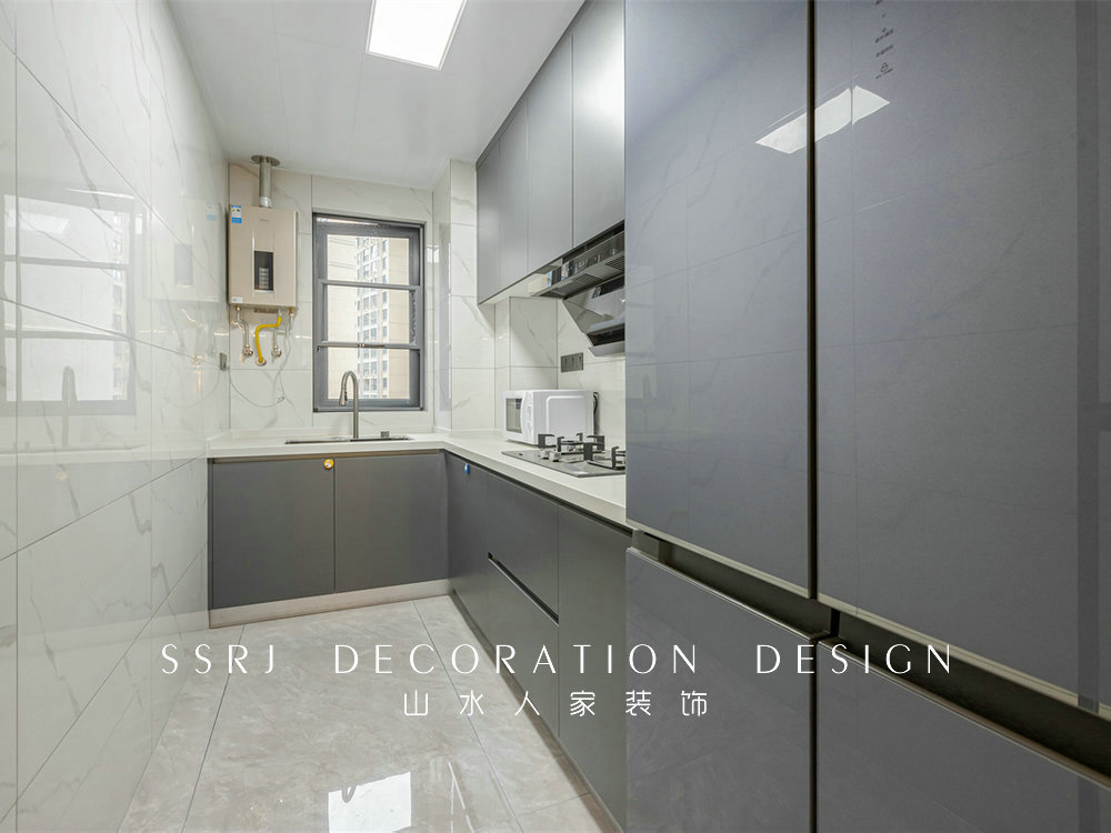 廚房以白色為基底布置,搭配魚(yú)肚白瓷磚,很少有壓抑感??臻g安裝充足櫥柜作為廚房收納,灰色柜門(mén)干凈高級(jí),整體留下了比較好的廚房印象。