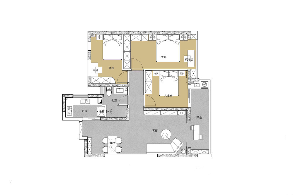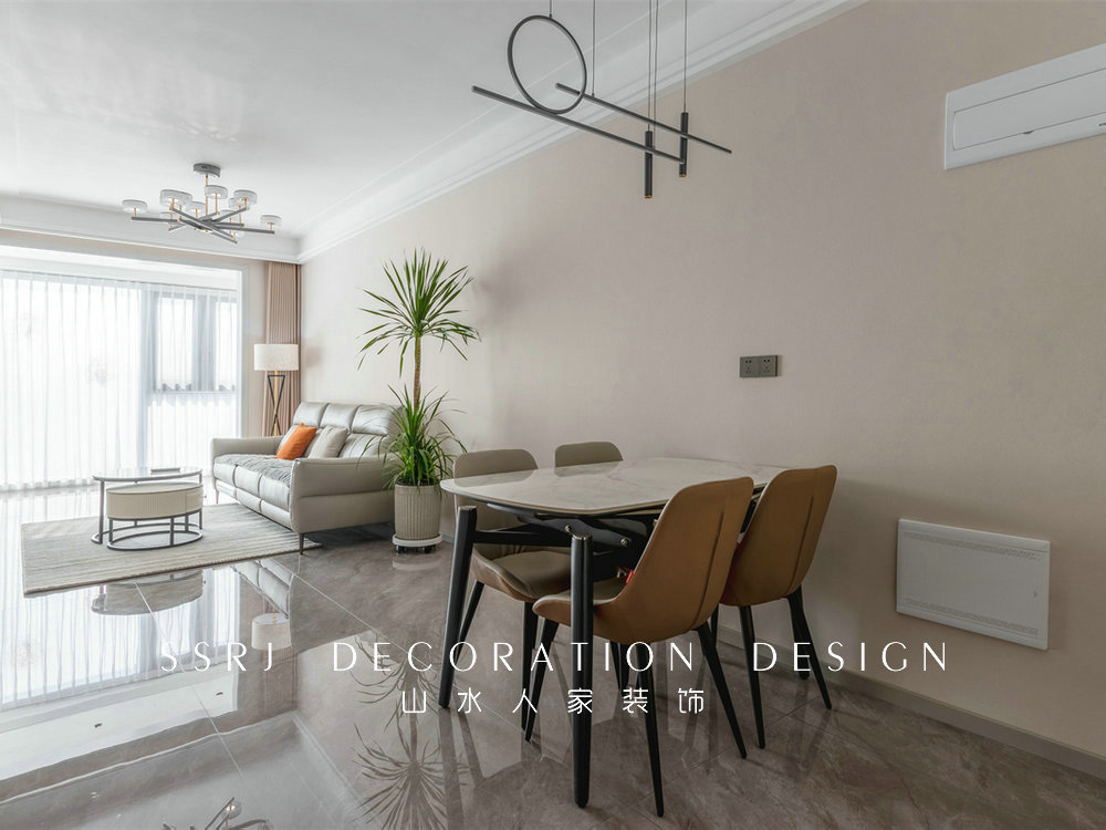 相應(yīng)的解決措施包括:(1)重新規(guī)劃空間布局,形成客廳-陽臺(tái)-臥室的溯回動(dòng)線;(2)廚房做了L型櫥柜,最大化利用邊角空間;(3)客餐廳一體,增強(qiáng)公共休閑區(qū)的通透感。