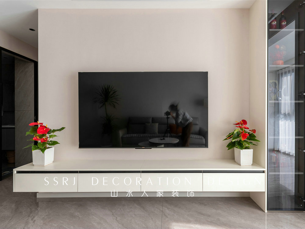 電視背景墻更顯清雅簡約,搭配懸空電視柜,達(dá)到一個(gè)收納的功能,底部做清潔也更加便利。旁邊則定制了到頂?shù)暮诓U故竟瘢胖恍┚姥b飾物,更能提高整體的空間調(diào)性。