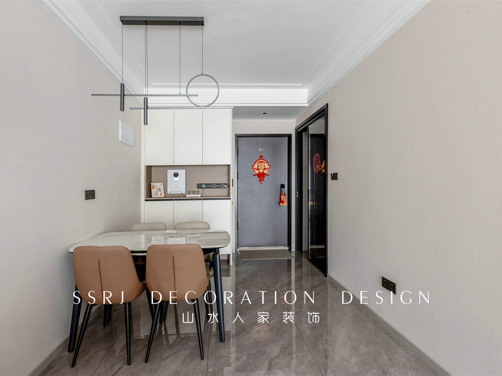 進(jìn)門處設(shè)置了玄關(guān)柜兼餐邊柜,充分起到收納儲(chǔ)物的作用。中間位置安排了直飲水機(jī)及插座,方便日常使用。餐桌則左移靠墻,騰出足夠?qū)挼倪^道距離。