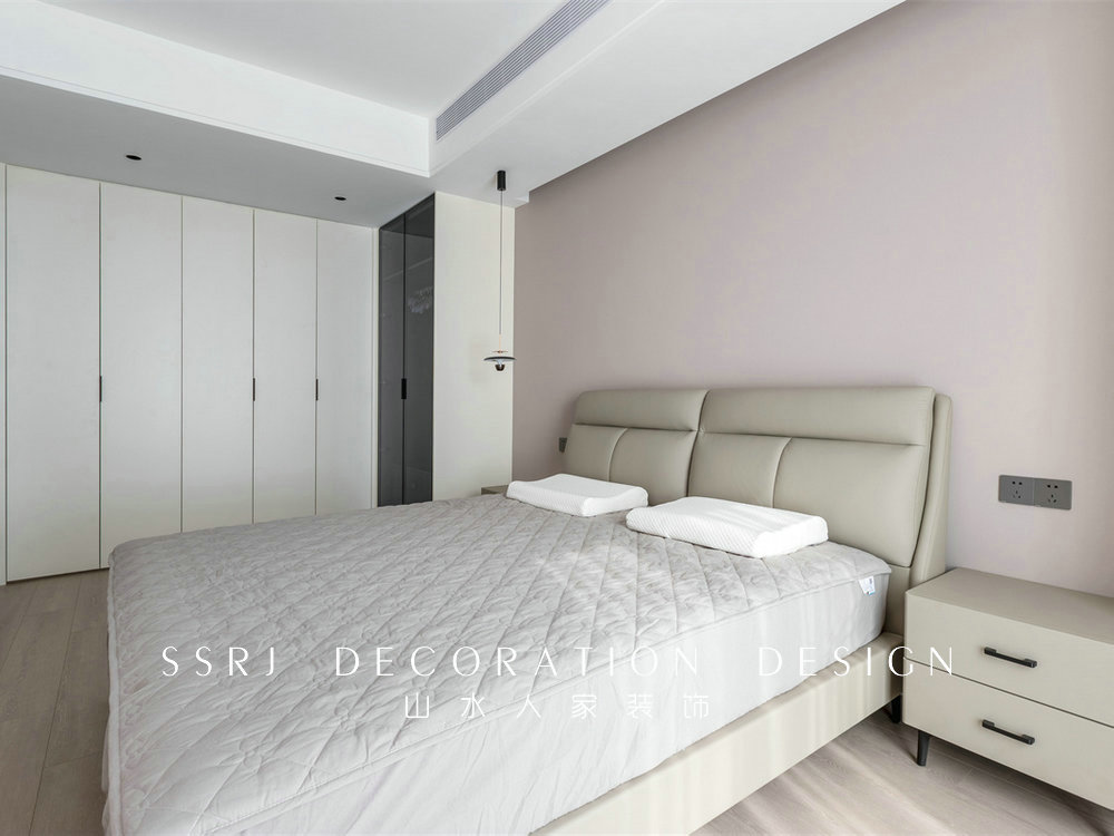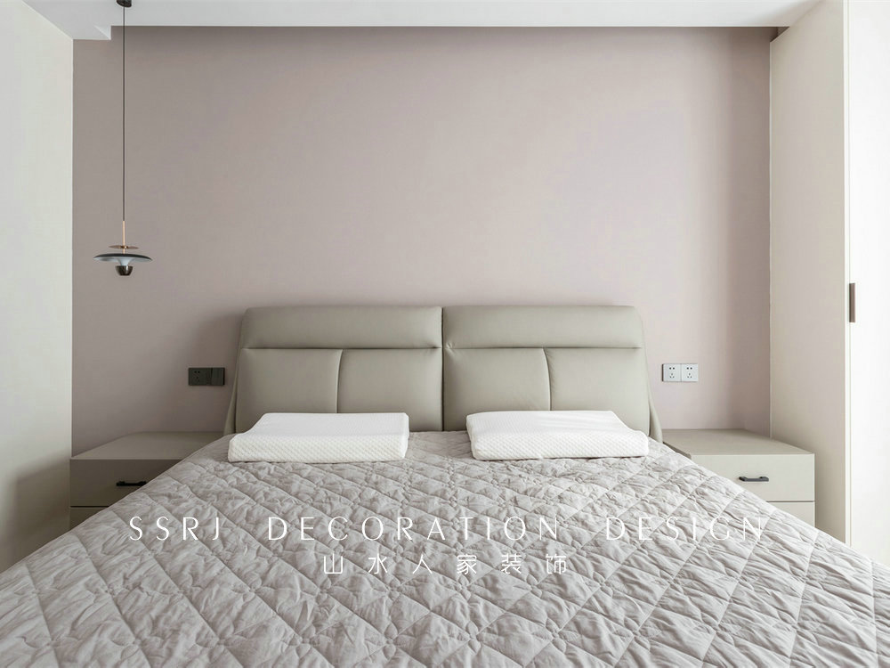 主臥墻面運(yùn)用暖色系的墻布,給人的感覺非常寧靜、平和。結(jié)合舒適床頭靠背,讓人一躺下來就感到無比地放松,利于緩解一天下來的疲憊。