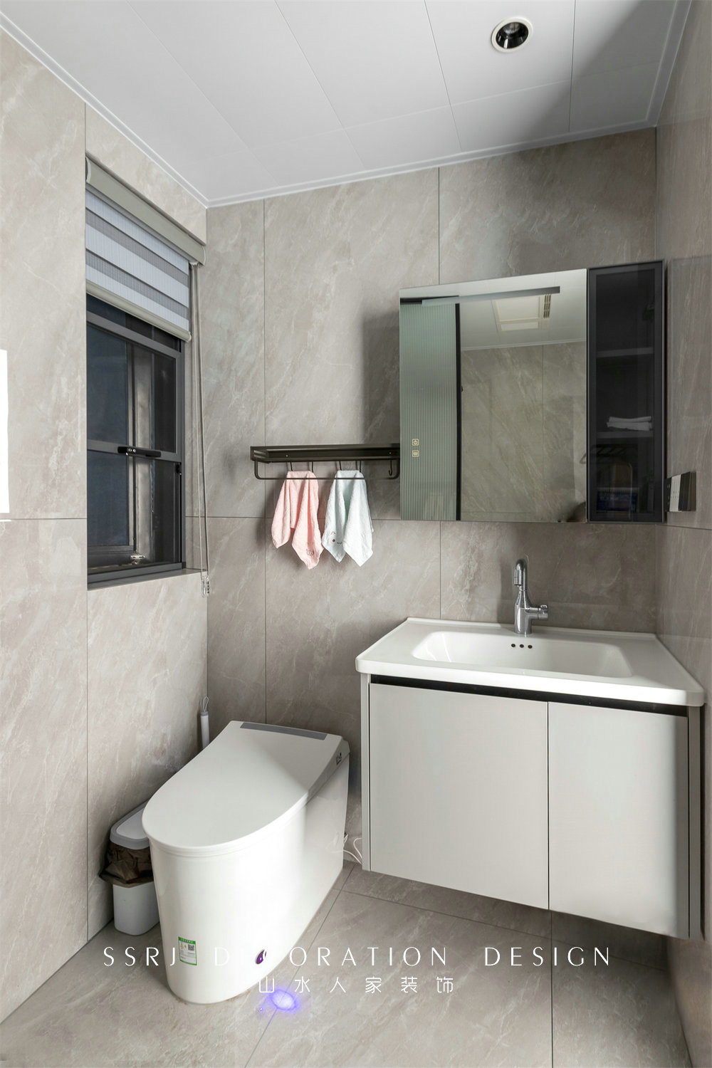 衛(wèi)生間相對緊湊,但很好地劃分出各個(gè)功能區(qū),有效提升使用效率。鏡柜搭配懸空浴室柜,儲(chǔ)物大且易于打理,底部預(yù)留充足空隙,方便日常衛(wèi)生清潔。