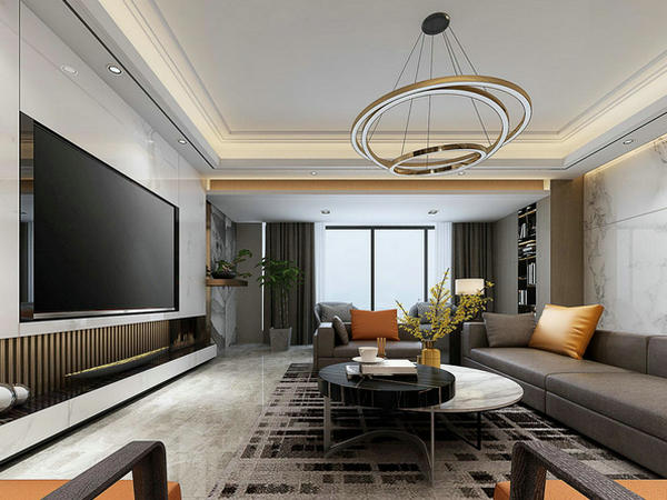 客廳天花板采用雙眼皮疊級設(shè)計(jì),簡約的視覺效果能有效拉高層高,緩解壓抑又提升整體的大氣感。地面滿鋪瓷磚,再鋪上一層地毯,充分彰顯了整個(gè)空間的安靜感受。