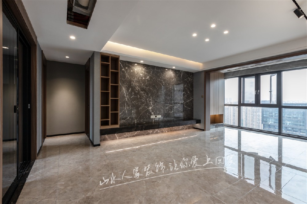 電視背景墻做成懸空樣式,中和了空間的肅穆感,更顯輕盈柔和。天然石材+木飾面,溫潤的木材與厚重的石料搭配,碰撞出前衛(wèi)的時尚感。電視內(nèi)嵌+開放格布置,以此增加空間美觀度。