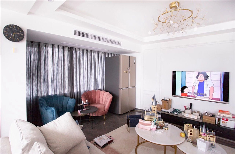 客廳天花板做了雙眼皮的吊頂,搭配無(wú)主燈設(shè)計(jì),成為一道靚麗風(fēng)景線。地面通鋪灰色大磚結(jié)合一整塊淺色地毯,彰顯精致簡(jiǎn)潔的格局。