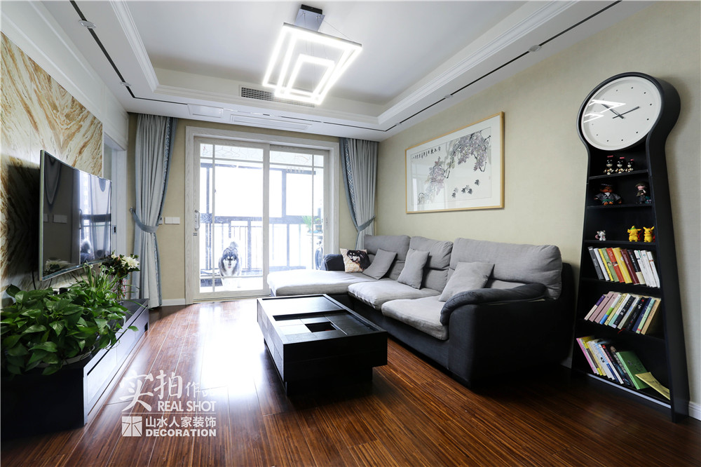 客廳做成橫廳結構,空間視野愈加開闊明朗。尤其是陽臺的自然融入,帶來了優(yōu)越的大落地窗采光,業(yè)主可以坐在沙發(fā)上一邊飲茶一邊觀景。地面則通鋪深灰色大地磚,凸顯沉穩(wěn)高級的空間氛圍。