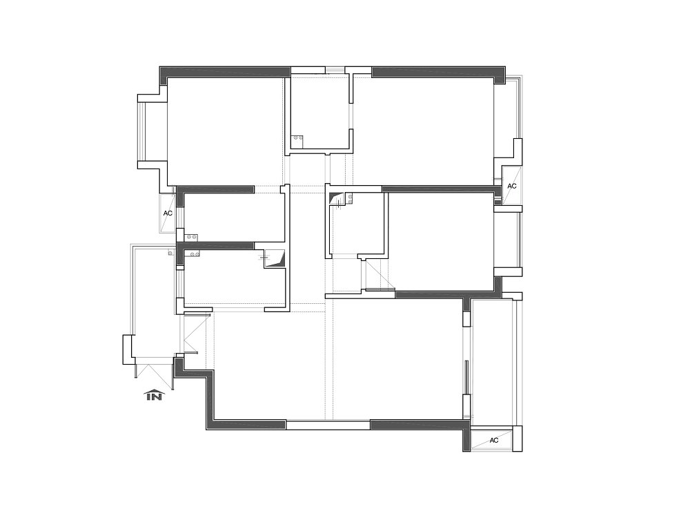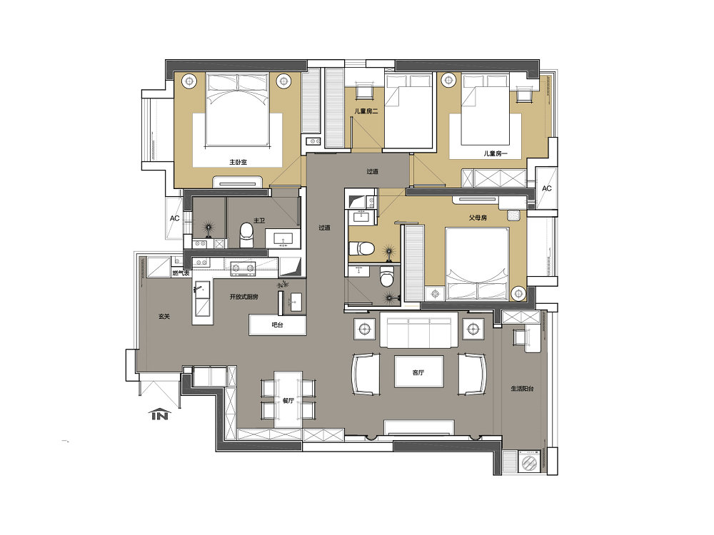 本案戶型方正,南北通透,針對業(yè)主的實際需要,將房屋裝成四房三衛(wèi)的格局。具體調整包括:(1)鞋柜放在門外,節(jié)省內部空間,將原本玄關柜變?yōu)楸湮?;?)打通陽臺連接客廳,增加空間采光,使得居室結構不再局促;(3)打造開放式廚房,提升空間通透感,打造優(yōu)良烹飪動線;(4)公共衛(wèi)生間將干區(qū)外置,實現(xiàn)干濕三分離。