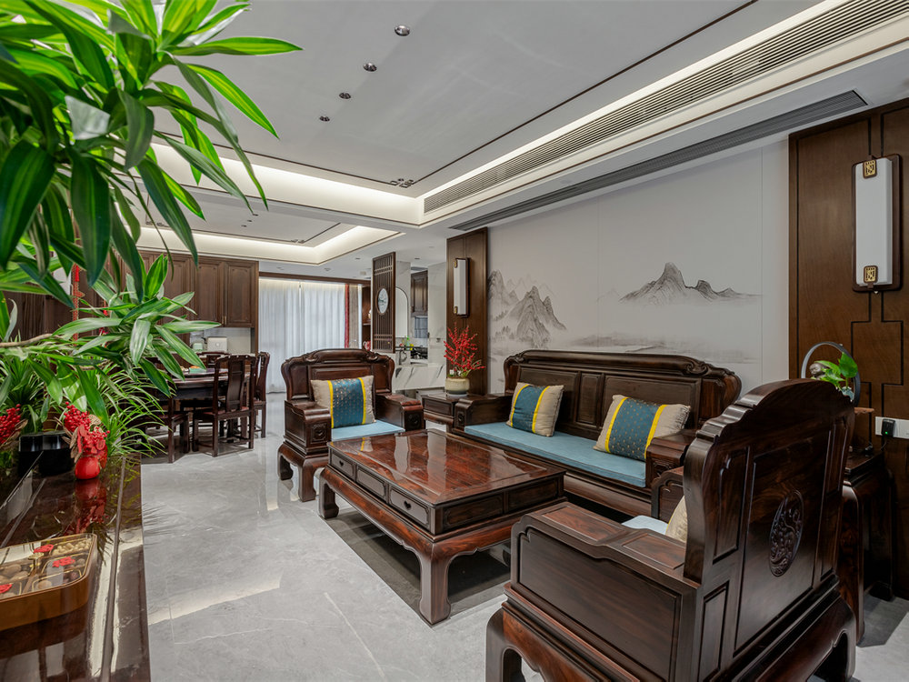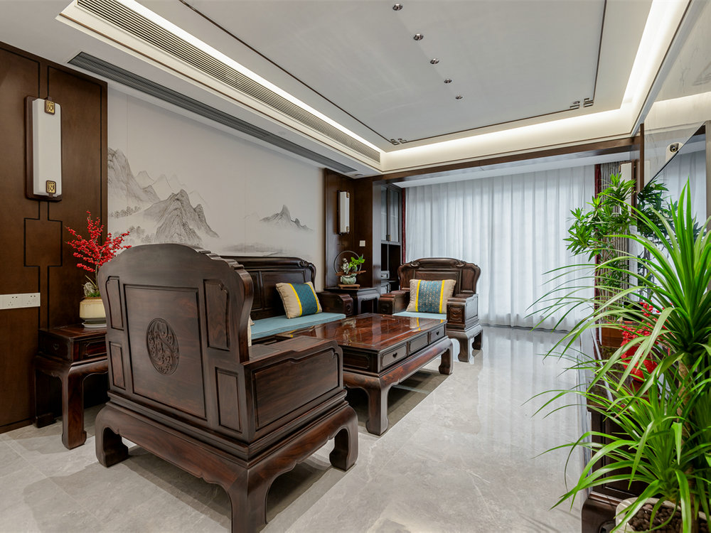 客廳中間擺放了紅木沙發(fā)茶幾,以圍合式布局展現(xiàn)源自東方的典雅。這是展示業(yè)主品味的地方,借用氣場來闡釋舒適的生活狀態(tài)。一家人可以圍坐在一起,談話氣氛更為融洽,打造良好的客廳聚心力。