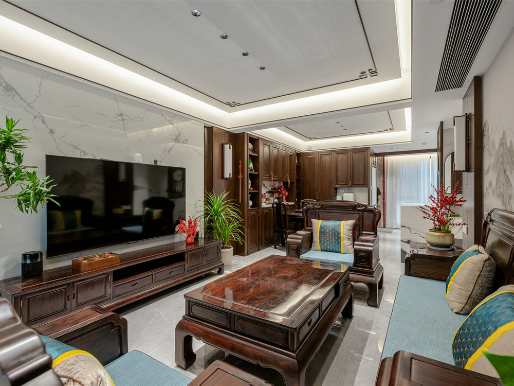 陽臺和客廳相連,擁有一整面落地窗,采光通風條件好。頂部采用懸浮吊頂,配上中式實木線條,使得整個居家環(huán)境穩(wěn)重又大方。