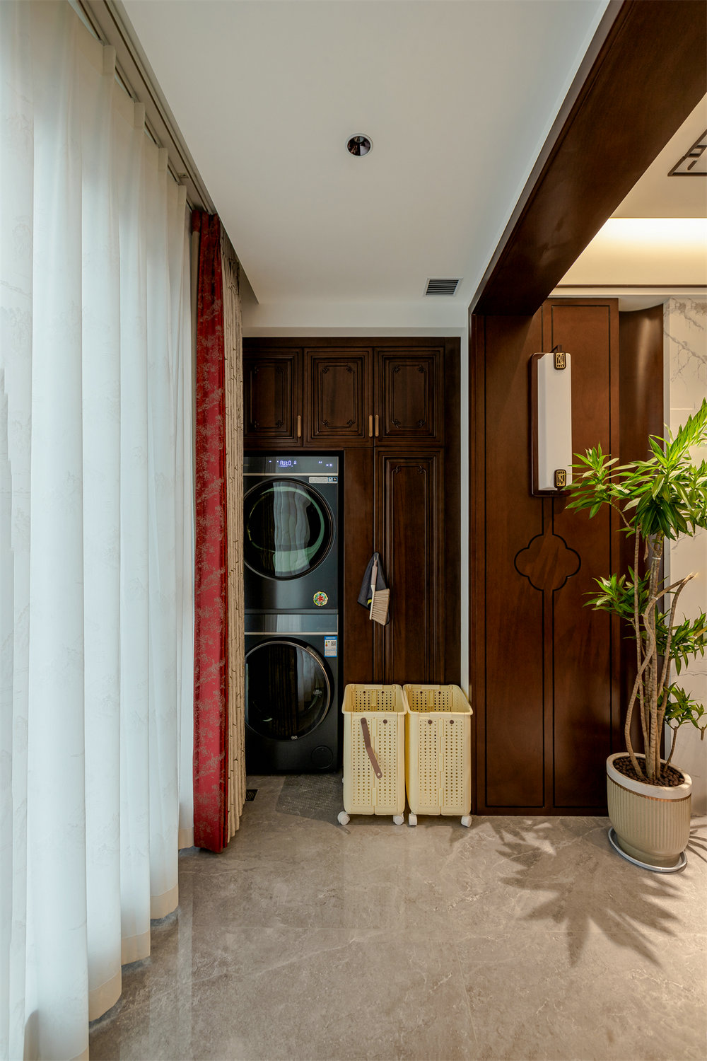 陽臺空間充分利用,一側定制了到頂衣柜和書桌。一體式設計進一步精簡空間,業(yè)主可以就著豐沛采光看書陶冶情操。另一邊則是洗烘套裝,相應滿足日常家居功能。