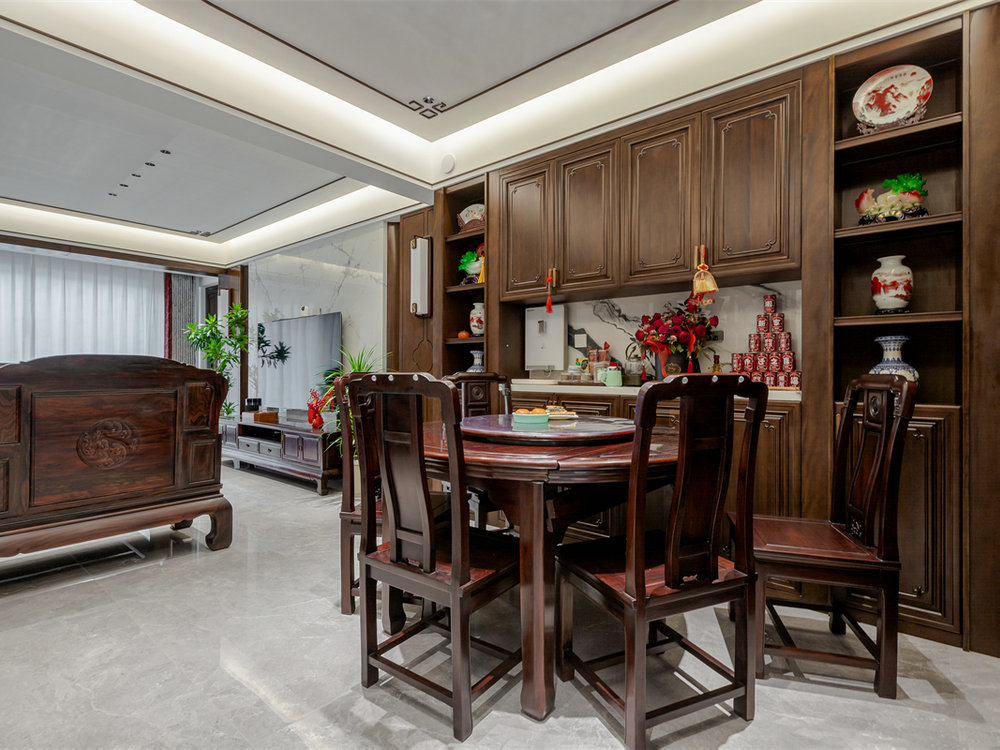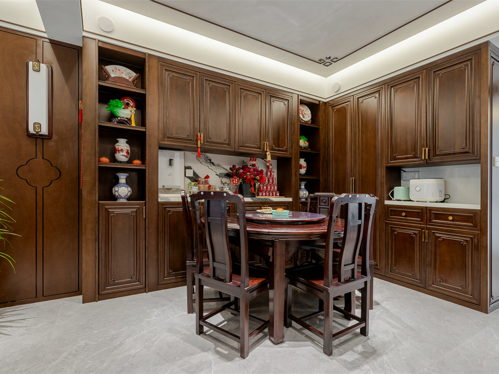 餐廳區(qū)域采用圓形大餐桌,寓意著一家人“團團圓圓”。整體同樣用到實木材質,同柜子配套使用,效果更佳。親朋好友來家做客,也有更多消遣放松的場所。