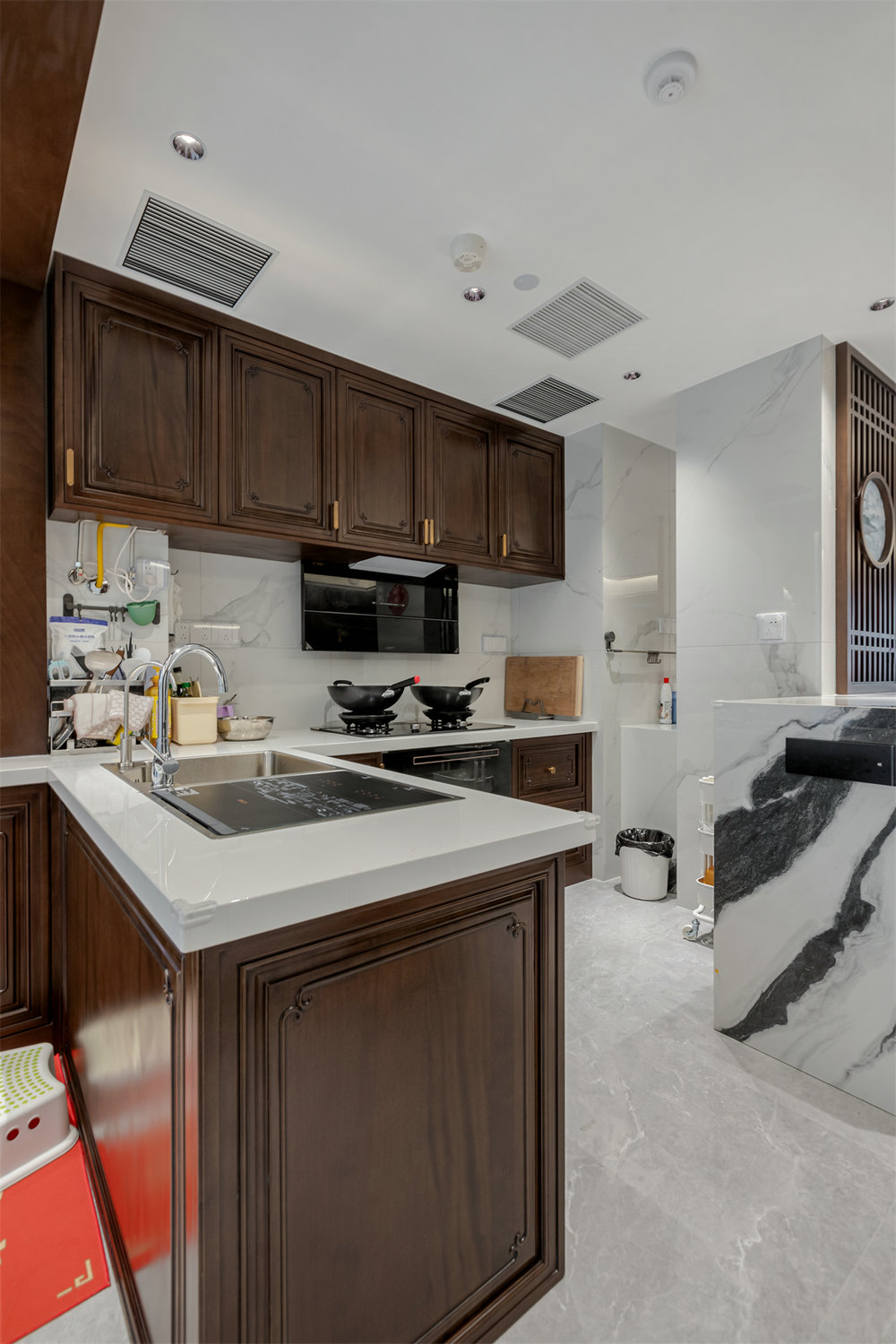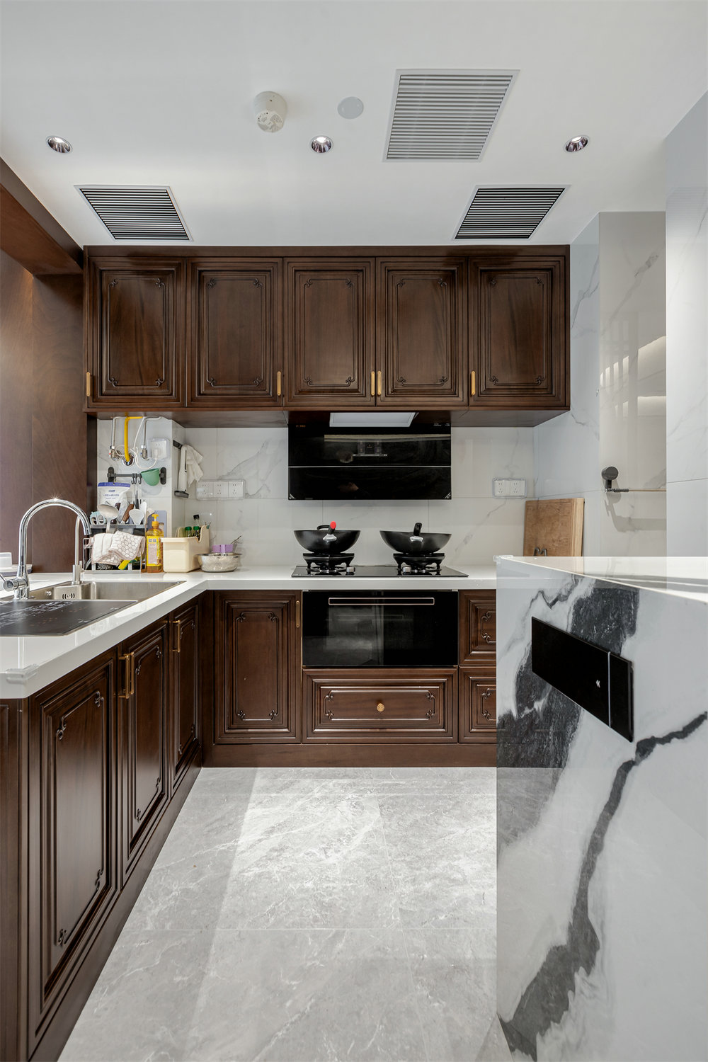廚房采用開放式設計,讓整個環(huán)境看起來開闊明亮。環(huán)形的操作臺面,盡可能多地利用廚房空間,滿足有關烹飪的多種需求。采用純實木材質制作的櫥柜,外觀高端有品位。