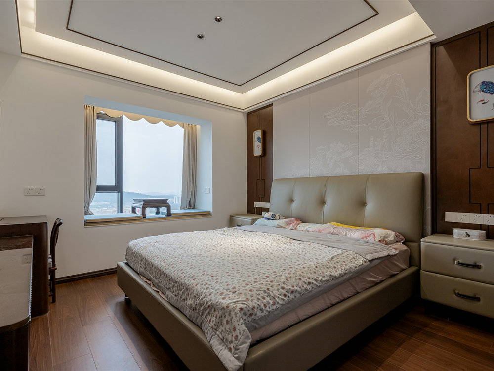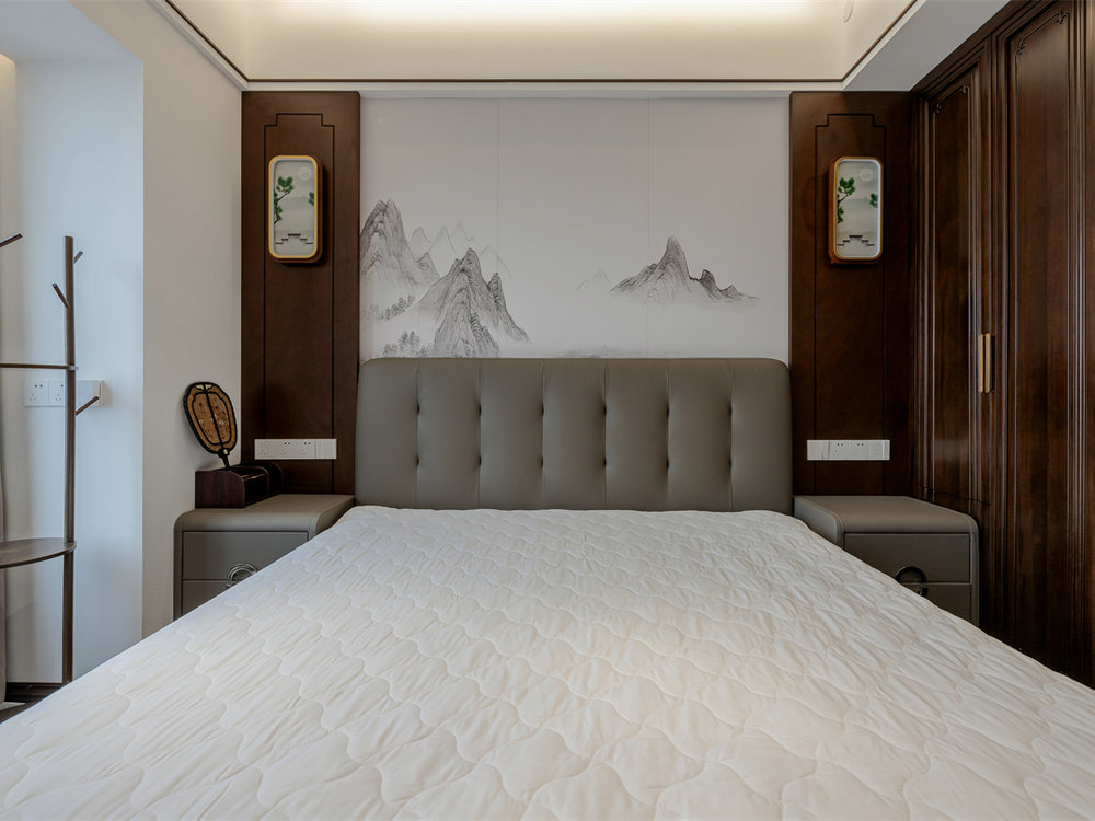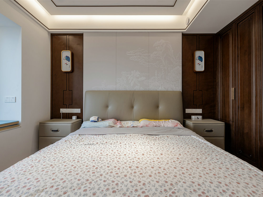 主臥背景墻選用墻板+木飾面的造型,天然紋理被懸浮頂燈光照得更加溫潤細膩,拓展出一個溫暖的休息區(qū)域,保障了極佳的睡眠質量。