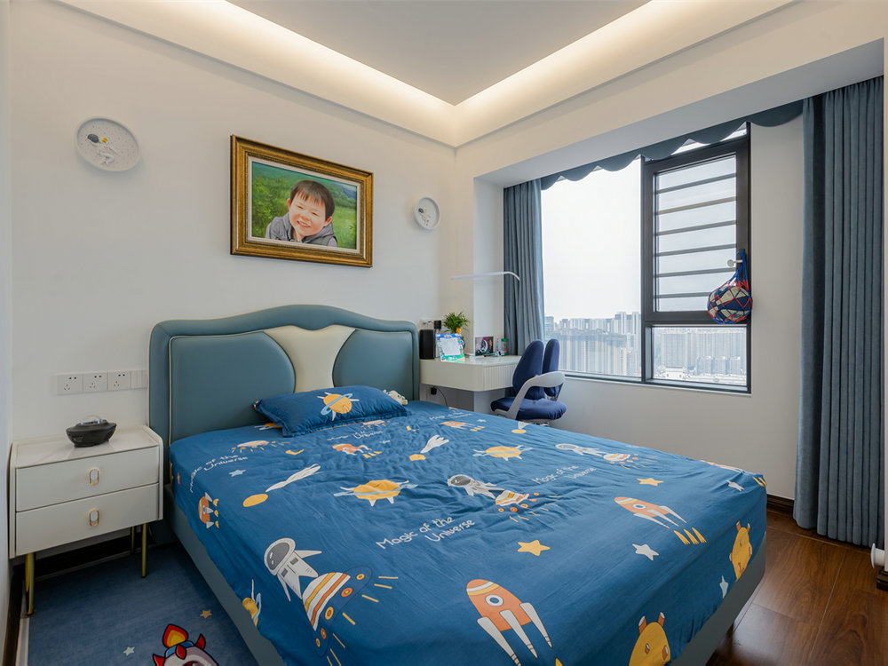 男孩房大面積留白,看起來更寬敞明亮。整體配色以天藍色為主,藍與白的結合,仿佛召喚出了碧海藍天般的遼闊與寧靜,充滿現(xiàn)代感與童趣。