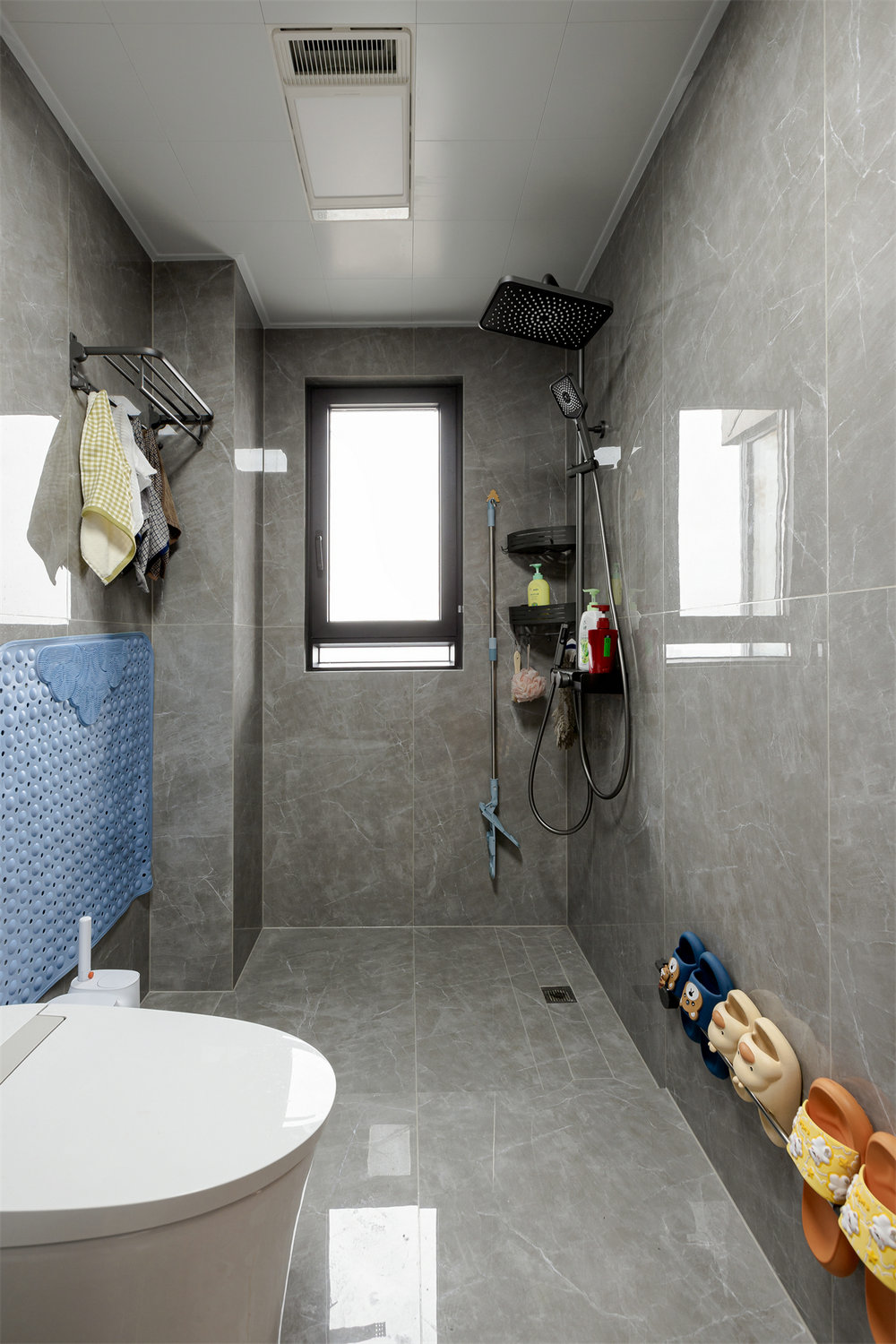 衛(wèi)生間墻面和地面都采用灰色瓷磚,呈現(xiàn)簡潔低調的氛圍。最里側是洗浴區(qū),墻上還安裝了置物架,擺放著一些洗浴用品,由此打造出舒適實用的浴室環(huán)境。