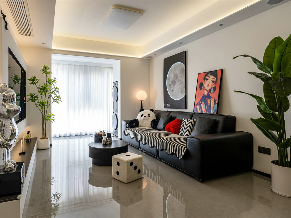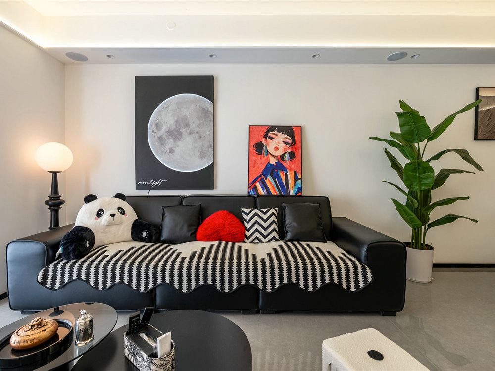 黑色皮沙發(fā)搭配同色系茶幾,時(shí)尚的組合下釋放出無(wú)限個(gè)性感,再加上軟萌的熊貓玩偶和紅心靠墊,注入愈多親和力。