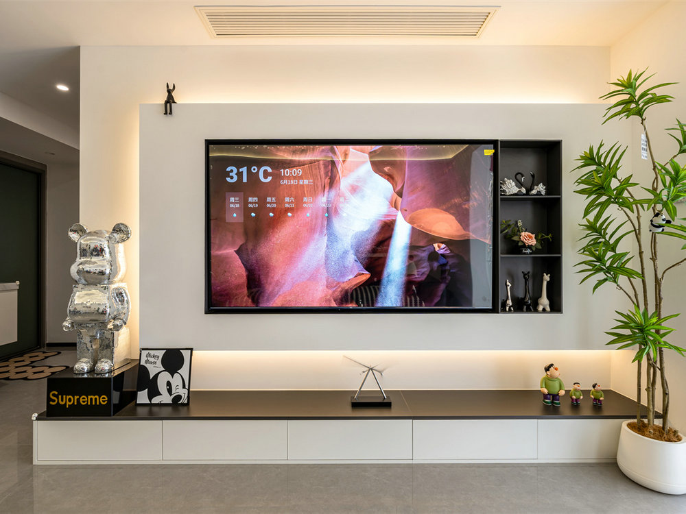 表層白色電視背景墻采用懸空設(shè)計(jì),里側(cè)暗藏暖光燈帶,豐富整體空間的層次感。下方則用黑色地臺(tái)做了內(nèi)嵌柜體,搭配上暴力熊擺件及琴葉榕植株,空間造型時(shí)尚滿分。