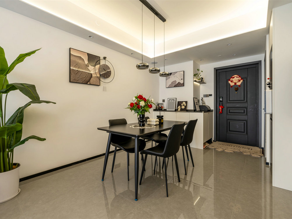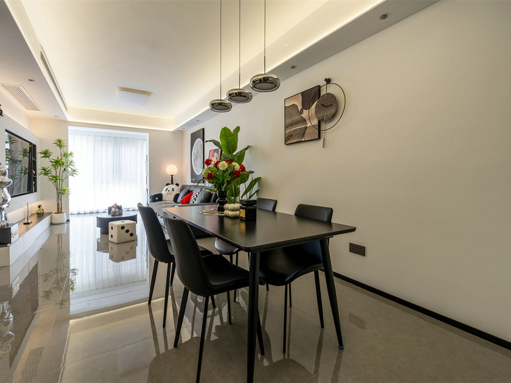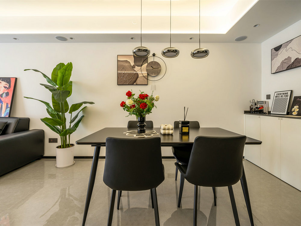 黑色餐桌搭配四把同色系餐椅,整體格調(diào)美觀時(shí)尚,且特別適合三代人同時(shí)用餐。頂部的吊燈以及墻面的裝飾品十分獨(dú)特也格外吸睛,大大提升了餐廳顏值。
