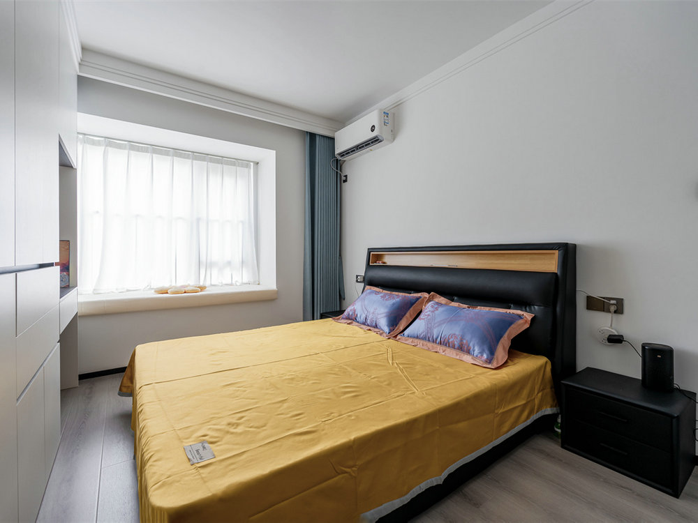 主臥保留飄窗,并將其改造成坐臥區(qū),實(shí)現(xiàn)區(qū)域的最大化利用。同時(shí)引進(jìn)優(yōu)越的采光,保持室內(nèi)的整潔透亮。淺米色墻面奠定柔和基調(diào),搭配明黃色床品,營(yíng)造放松氛圍。