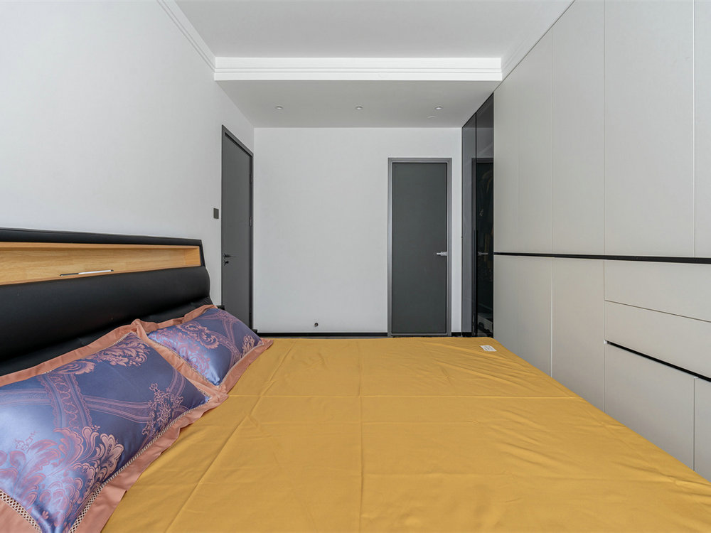 主臥比較大,留出了充足的活動(dòng)空間。特別是床尾定制了超大的到頂衣柜墻,整體選用白色柜門搭配黑色裝飾條,與墻面形成視覺延續(xù)。