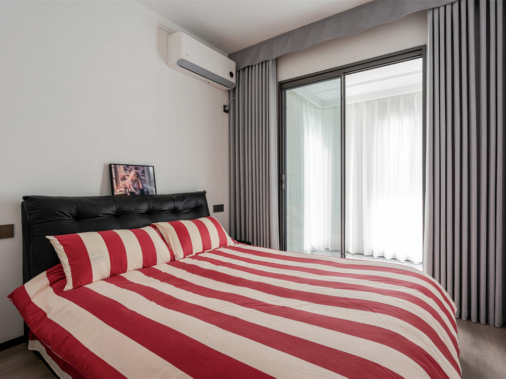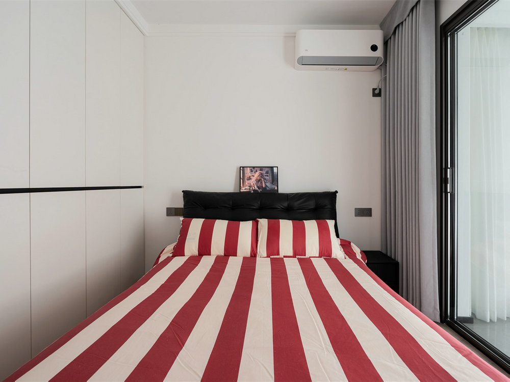 次臥設(shè)計(jì)更注重細(xì)節(jié),留白背景墻搭配黑色床頭,很好地起到點(diǎn)睛效果。紅色條紋床飾格外顯眼,將房間的格調(diào)提升到一個(gè)全新的高度。