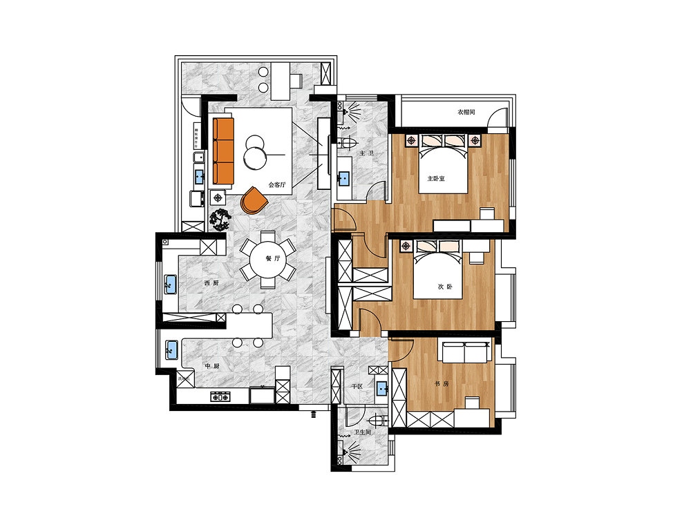 本案戶型方正,南北通透,為了滿足業(yè)主的生活需求,對(duì)房型做出如下調(diào)整:(1)打通陽(yáng)臺(tái)和客廳,增加采光面,同時(shí)設(shè)置了茶室空間;(2)采用開(kāi)放式布局,廚房與餐廳通過(guò)中央島臺(tái)自然銜接;(3)主衛(wèi)采用雙臺(tái)盆+獨(dú)立淋浴區(qū)的布局,相應(yīng)提升使用效率。