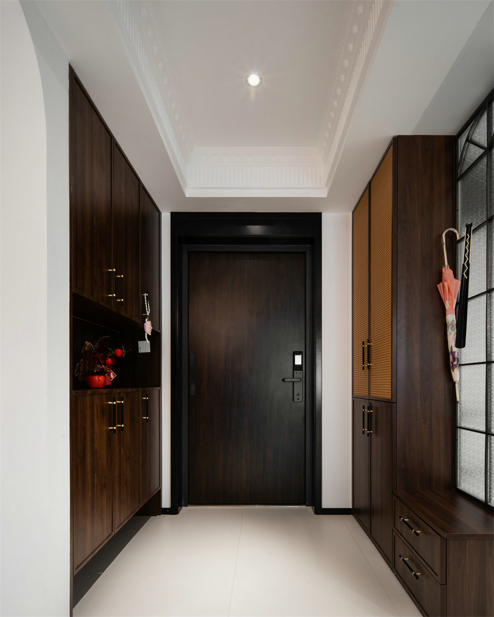 進(jìn)門兩邊均定制儲(chǔ)物玄關(guān)柜,高度直達(dá)吊頂,最大化收納容量,中部預(yù)留開(kāi)放隔層打破壓迫感。深色橡木飾面搭配藤編面板,充分展現(xiàn)溫潤(rùn)木材肌理,創(chuàng)造更多視覺(jué)透氣性。