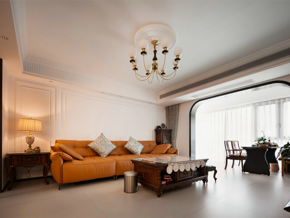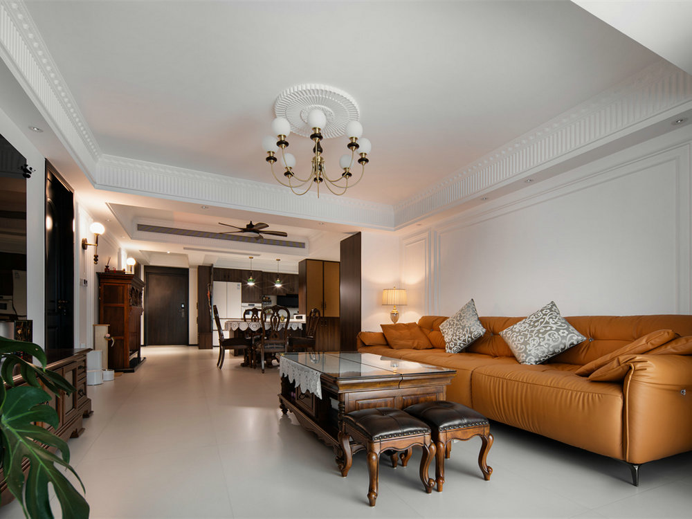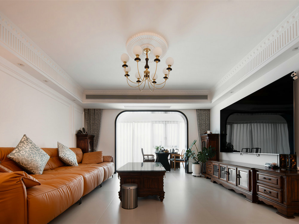 客廳天花和墻面用石膏線裝飾勾勒出中古風(fēng)韻美感,搭配中央的金色大吊燈,彰顯華麗氣質(zhì)。地面柔光磚通鋪,一體無(wú)縫,增添細(xì)節(jié)精致感。
