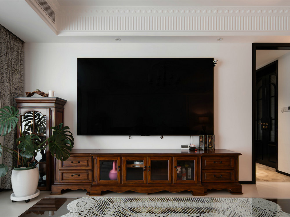 電視區(qū)域的色彩保持簡(jiǎn)潔,黑色電視搭配白色墻面,給人一種自然舒適的感覺(jué)。實(shí)木組合電視柜與地面形成視覺(jué)穩(wěn)定感,整體兼顧到了展示與收納功能。