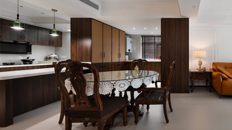 深色木質(zhì)圓桌搭配雕花餐椅,與廚房保持充足安全距離。桌面鋪設(shè)了蕾絲桌布,既保護(hù)臺(tái)面又增添不少精致感。由此一來(lái)為一家人用餐提供了優(yōu)良環(huán)境,這里同樣成為家里小貓玩樂(lè)的場(chǎng)所。