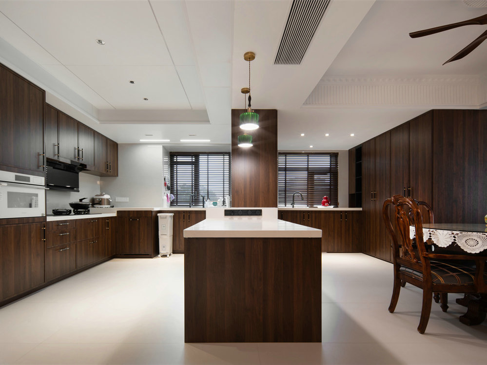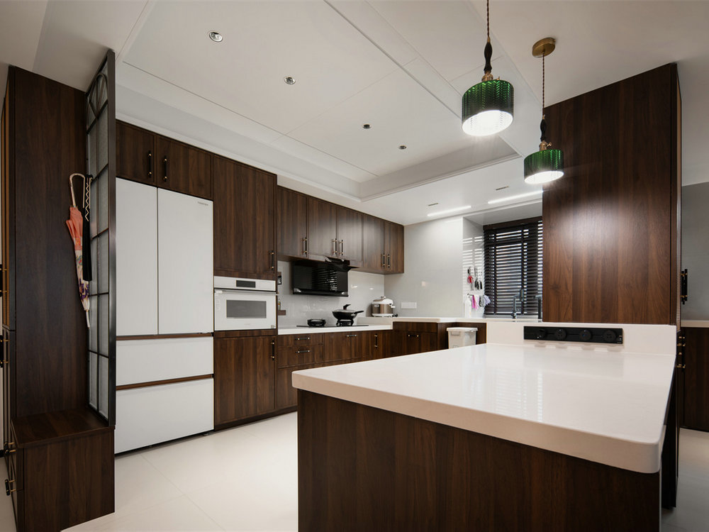 廚房采用傳統(tǒng)L型設(shè)計(jì),深棕色木質(zhì)櫥柜沿墻延伸,更多彰顯美觀實(shí)用性。白色石英石臺(tái)面保持表面整潔,加上冰箱、烤箱等電器嵌入式設(shè)計(jì),展現(xiàn)純粹生活態(tài)度。
