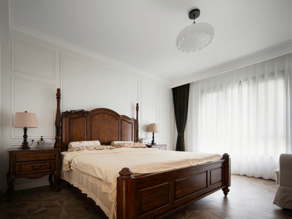 主臥采用深棕木色搭配米白色,打造溫馨沉穩(wěn)的視覺(jué)效果。應(yīng)用白色紗簾實(shí)現(xiàn)柔光過(guò)濾,光線漫射營(yíng)造宜人光環(huán)境。臥室以1.8m木質(zhì)雕花床為核心,床尾保留充足通行間距,維持空間平衡感。