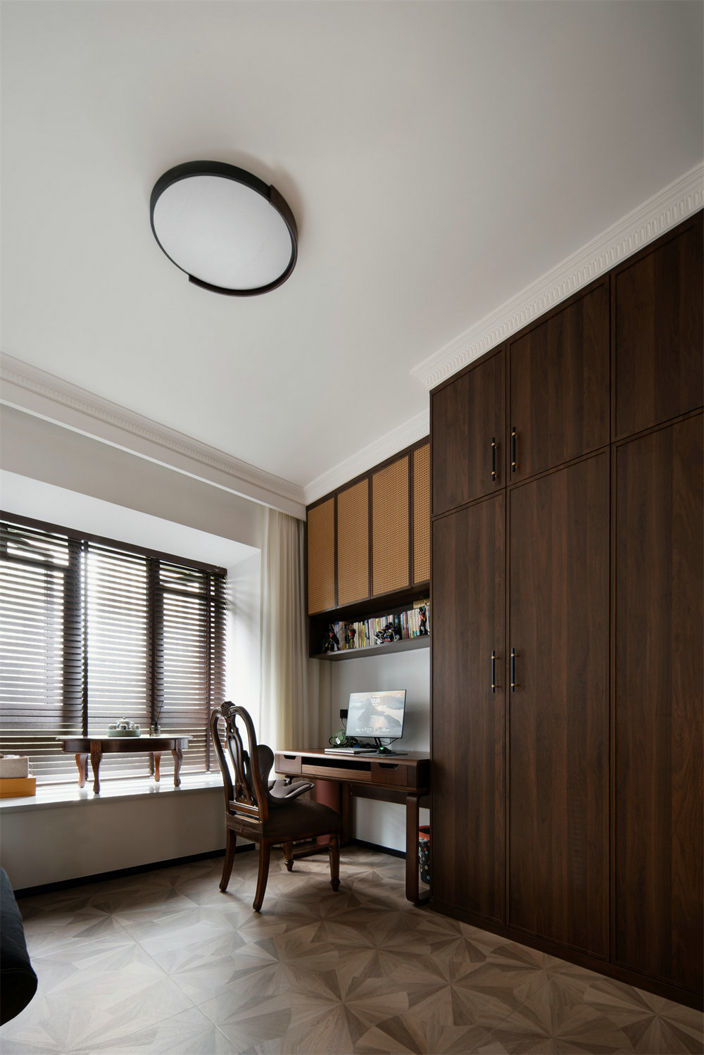 書房保留飄窗并予以延伸形成邊桌,即可放置綠植又可當(dāng)作休閑角。書桌同樣緊貼東向飄窗,形成自然光充足的工作面。另一邊則無(wú)縫銜接了通頂?shù)膶?shí)木收納柜,整體造型古樸又大氣。