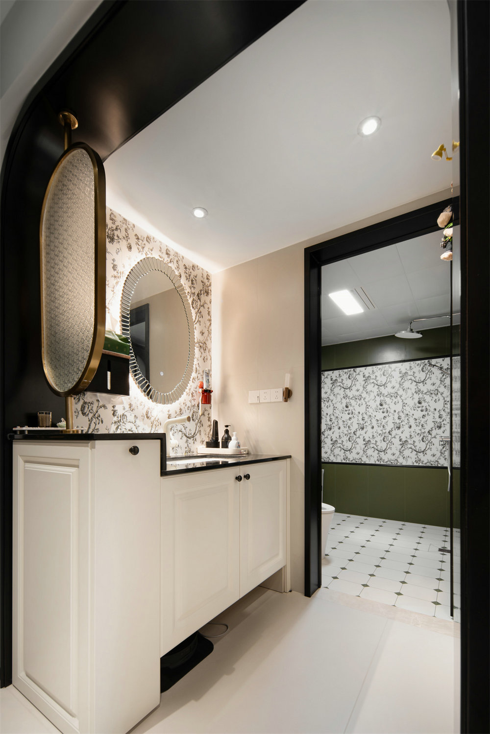 衛(wèi)生間布局上采用經(jīng)典的干濕分離設(shè)計(jì),干區(qū)借助黑框裝飾條與里側(cè)淋浴區(qū)實(shí)現(xiàn)功能分區(qū)。其中洗手臺(tái)采用啞光白臺(tái)面,搭配圓鏡造型,空間更顯明亮大氣。墻面局部選用花鳥(niǎo)壁紙,既呼應(yīng)中古元素又避免過(guò)度裝飾。