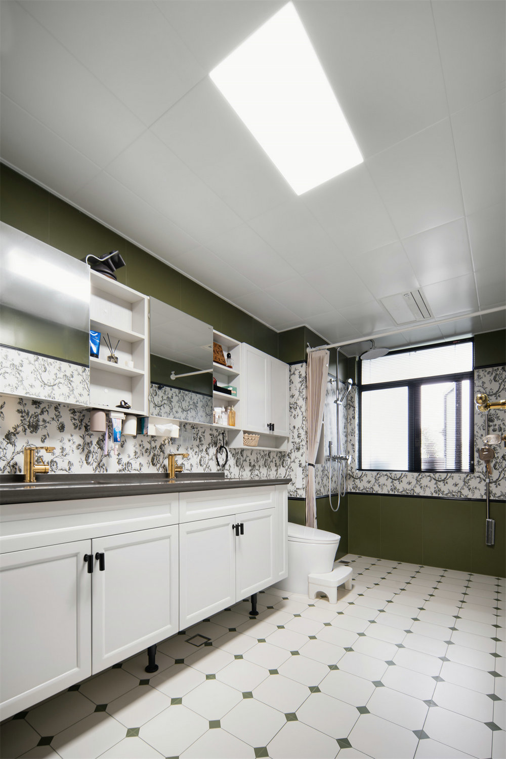主衛(wèi)采用雙臺(tái)盆+獨(dú)立淋浴區(qū)的布局,有效提升了家人的使用效率,避免出現(xiàn)爭(zhēng)用衛(wèi)生間的情況。主色調(diào)采用白+綠的清新組合,既保持了衛(wèi)生間的潔凈感,又注入愈多自然生機(jī)。