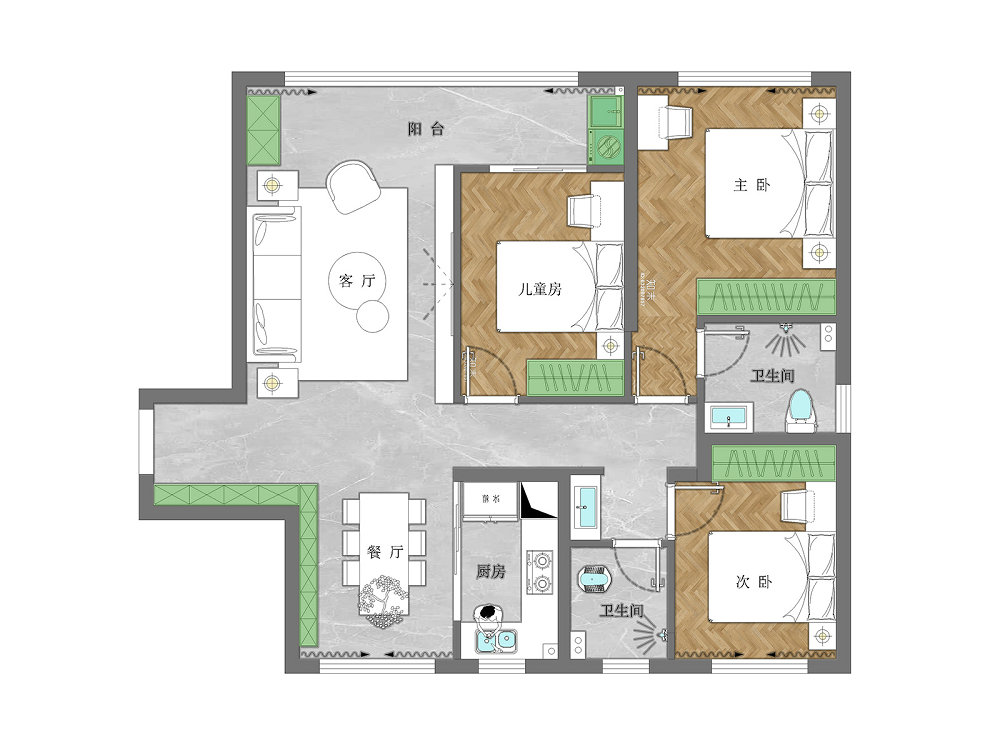 本案戶型方正,南北通透,要保留基礎(chǔ)三房結(jié)構(gòu)。主要的調(diào)整點在于:(1)聯(lián)通客廳、陽臺和兒童房,強(qiáng)化空間通透感,同時形成流暢生活動線;(2)玄關(guān)柜與餐邊柜一體設(shè)計,方便置物,更節(jié)省空間;(3)公衛(wèi)干區(qū)外置,有效實現(xiàn)干濕分離。