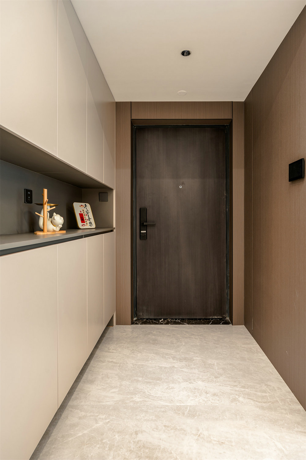 入戶階段墻面均由木飾面板所覆蓋,一進(jìn)門就能感受到家的放松與舒適??繅Χㄖ埔徽嫘P(guān)柜,淺色面板簡約大氣。中間及底部采用留空處理,強(qiáng)化整體的功能性。