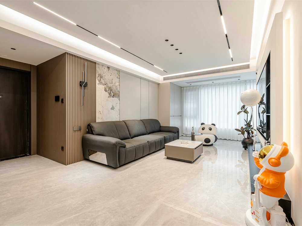 沙發(fā)背景墻采用格柵+木飾面+潘多拉巖板的設(shè)計,淺色系搭配看起來溫馨又大方?;疑笊嘲l(fā)坐感舒適,搭配熊貓造型單椅,打破了中性色系的單調(diào)感,形成強(qiáng)烈的視覺沖擊。